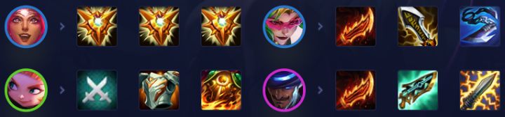 1.钢铁烈阳之匣 2.斯塔缇克电刃 3.鬼索的狂暴之刃(崔斯特) 4.钢铁烈阳之匣 5.海克斯科技枪刃 6.决斗大师纹章 7.无尽之刃 8.钢铁烈阳之匣 9.巨人杀手 10.鬼索的狂暴之刃(薇恩) 11.日炎斗篷 12.石像鬼石板甲