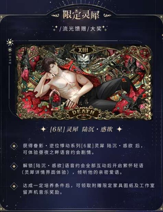 获得六星灵犀陆沉・惑欲并达成一定培养条件后,设计师可在灵犀详情界面左上角灵犀奖励处领取附赠限定家具图纸及工作室留声机音乐。