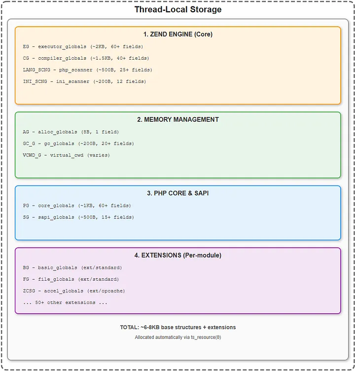 PHP 用线程局部存储(Thread-Local Storage,TLS)保存每个线程的 VM 状态。这对 ZTS(Zend Thread Safety)模式下线程间隔离很关键。