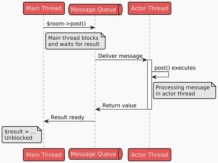 ChatRoom 对象特殊。它们的数据和 PHP VM 状态本地化了,方便在线程间移动。每个方法在自己的线程跑,但任何时刻只有一个线程能执行给定 actor 的方法。