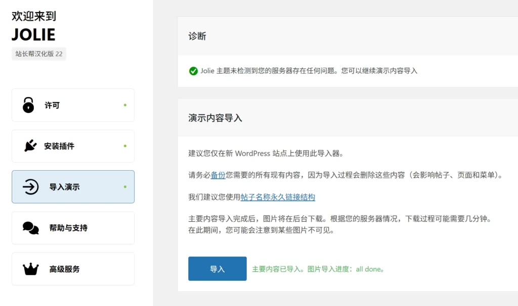 - 导入演示时需注意:必需启用 Elementor Pro ,在主要内容导入完成后,图片将在后台下载。根据服务器情况,整个下载过程可能需要几分钟。
