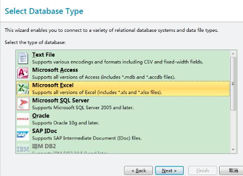 - 在BarTender中,单击工具栏中的数据库连接设置按钮。打开数据库连接向导。选择数据库类型Excel,单击下一步。