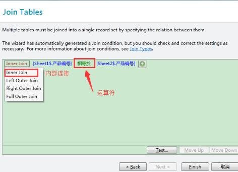 - 在此对话框中,选择BarTender数据库连接类型——内部连接,选择运算符"相等于"。此设置将实现连接EXCEL的多个工作表。本例中是两个工作表,如需连接更多工作表,可单击按钮进行添加。单击完成即可。