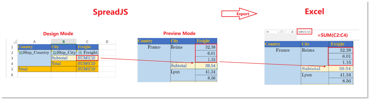 - 不连续区域引用 :对于 SUM、AVERAGE、MIN、MAX 等聚合函数,即使报表生成的区域不连续,SpreadJS 也会智能地将其导出为多个区域的组合引用。