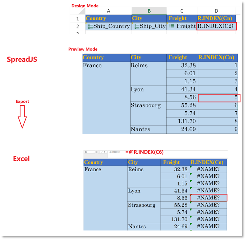 对于如 R.Index、R.Rank、R.YoY(同比)等 SpreadJS 专有的报表函数,导出时会保留其函数名和引用。虽然 Excel 原生不支持这些函数(会显示为 #NAME?),但这为二次开发或后续回导提供了珍贵的元数据信息。