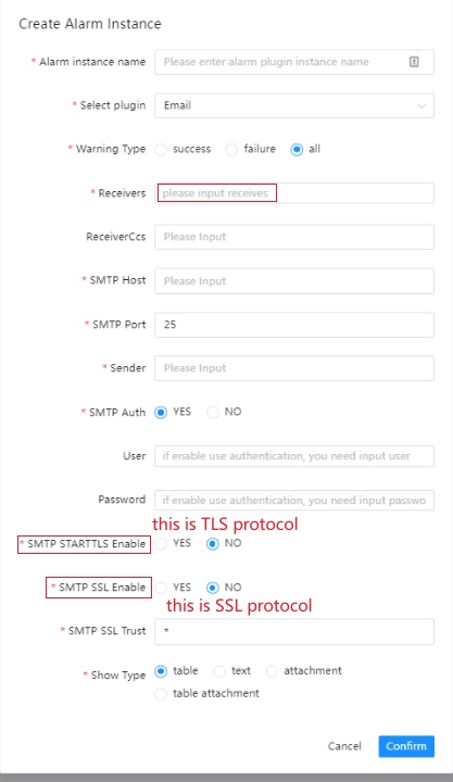 Email告警实例需要配置以下关键参数: