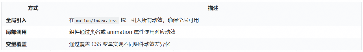 为方便维护和扩展,动效按类型拆分为多个 LESS 文件: