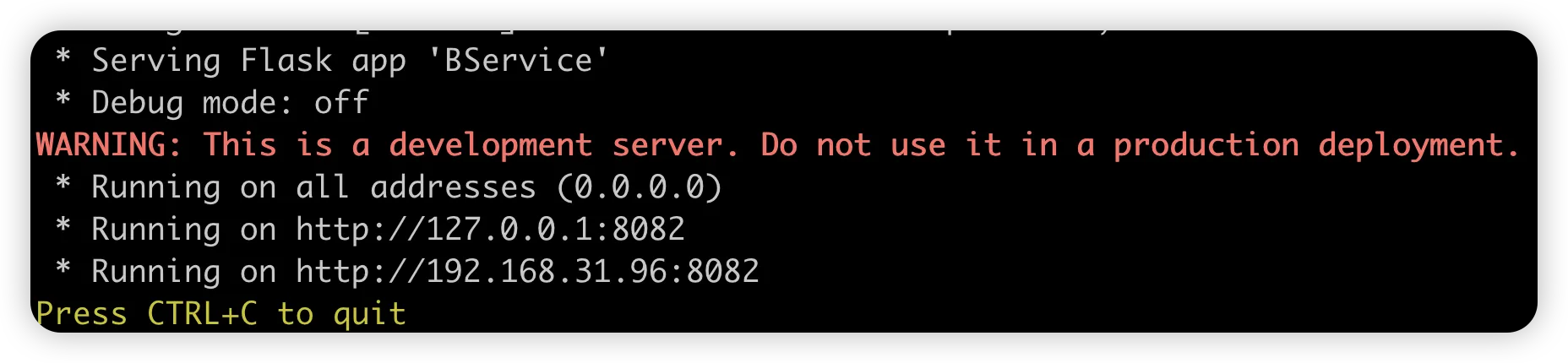 from flask import Flaskimport requestsapp = Flask(__name__)SERVICE_A_URL = 'http://localhost:8081/a'@app.route('/b', methods=['GET'])def call_service_a(): response = requests.get(SERVICE_A_URL) if response.status_code == 200: return f"Hello, I'am Server B and {response.text} from Service A' else: return 'Error calling Service A'if __name__ == '__main__': app.run(host='0.0.0.0',port=8082)运行前,要安装好依赖。