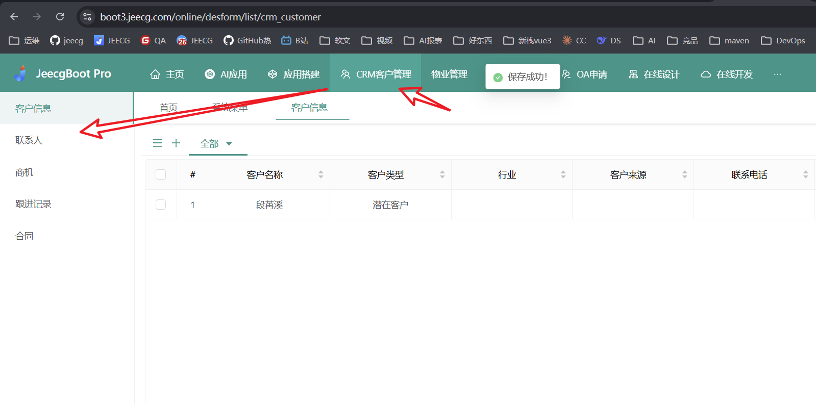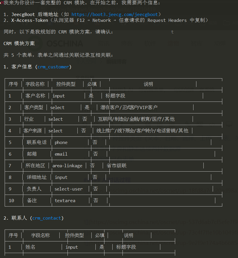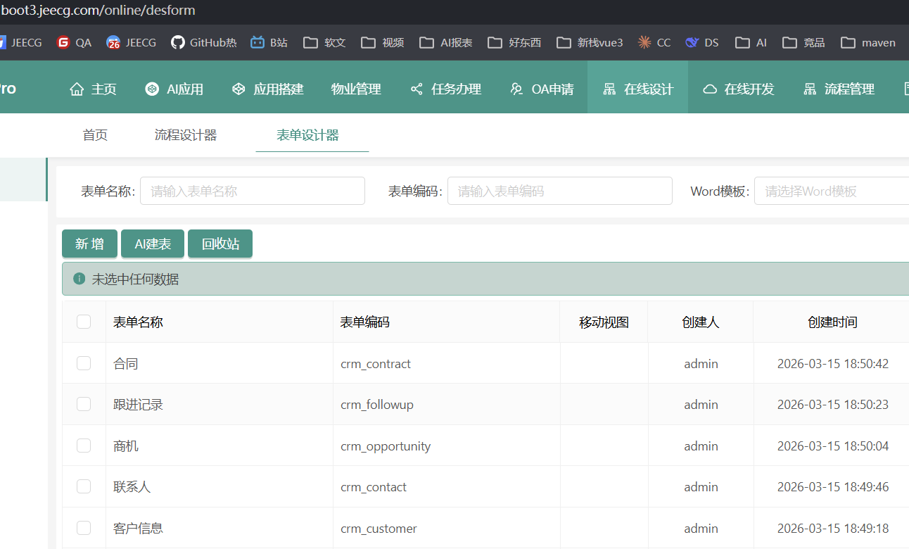 在JeecgBoot表单设计器中,可直观查看AI生成的CRM表单:
