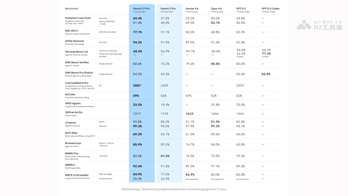 作为Gemini 3系列的首个迭代版本,Gemini 3.1 Pro在推理性能上取得显著进步。该模型在ARC-AGI-2测试中的得分从31.1%提升至77.1%,增幅高达148%,创下单代最大提升记录。相比GPT-5.2和Claude Opus 4.6,其在多个关键指标上保持领先。特别适合处理科学计算、数据可视化等复杂任务,并支持超长上下文处理。