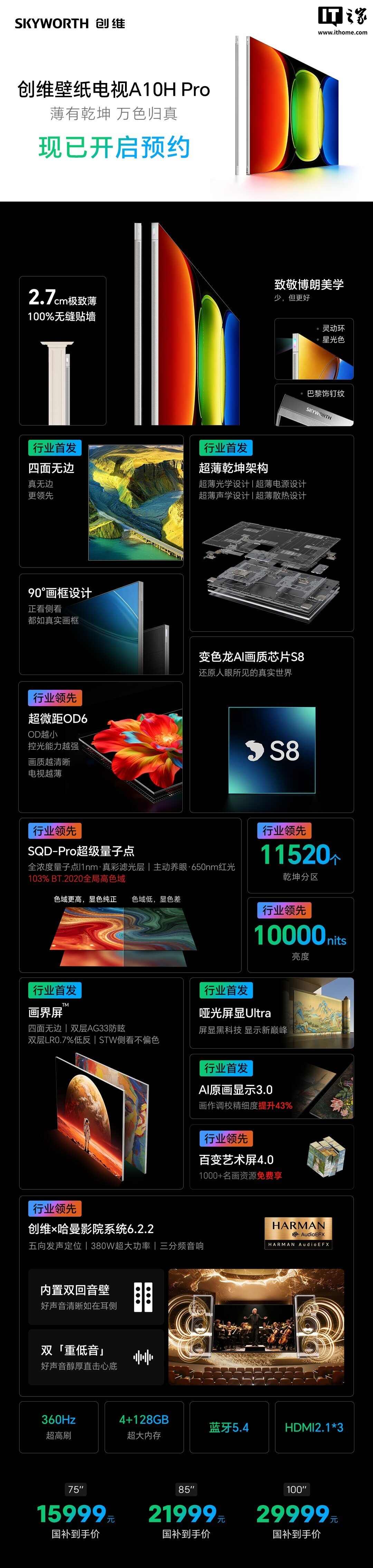 创维A10H系列壁纸电视凭借前沿显示技术和艺术化设计,为追求高品质影音体验的用户提供了全新选择,目前各型号均已开放预约购买。