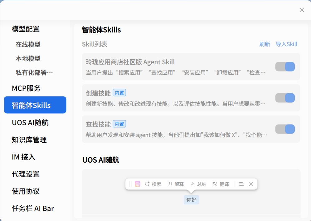 - UOS AI作为深度适配的原生组件,在应用商店提供一键安装功能,彻底免除了技术门槛