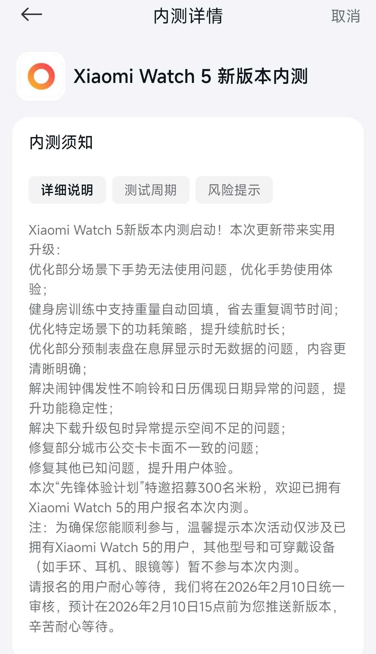 小米手表5迎来新版本内测招募,300个名额限时开放报名。本次更新重点优化了健身训练和系统稳定性,带来多项实用功能改进。
