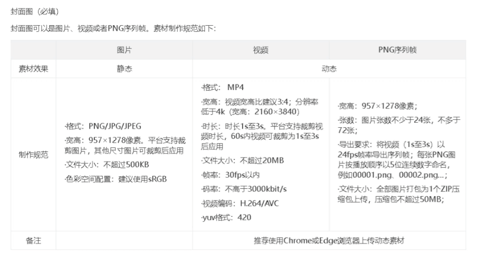 封面素材支持静态图片、视频或PNG序列帧,但必须符合平台规范要求。