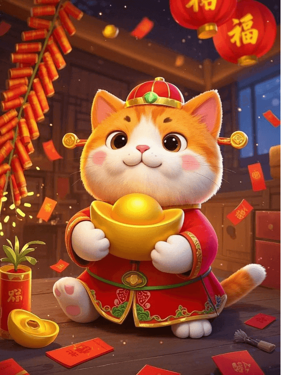 示例2:3D卡通橘猫形象,佩戴财神帽手持金元宝拜年造型