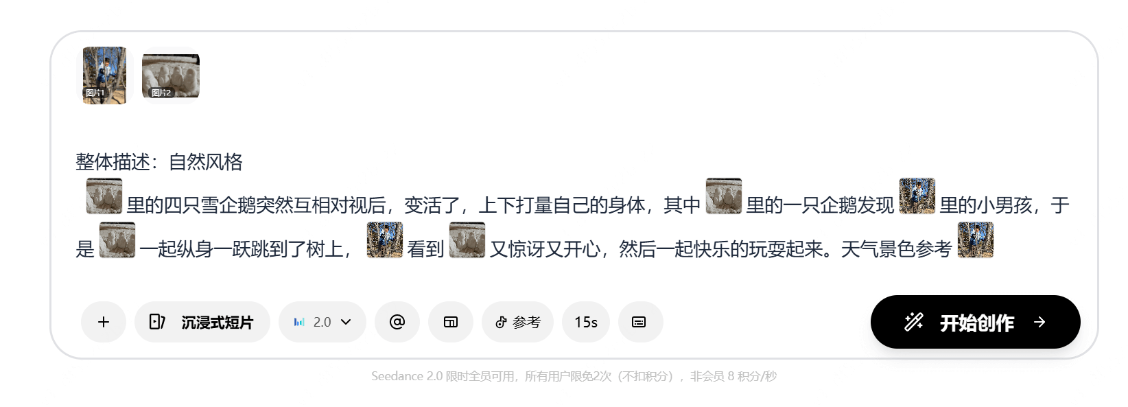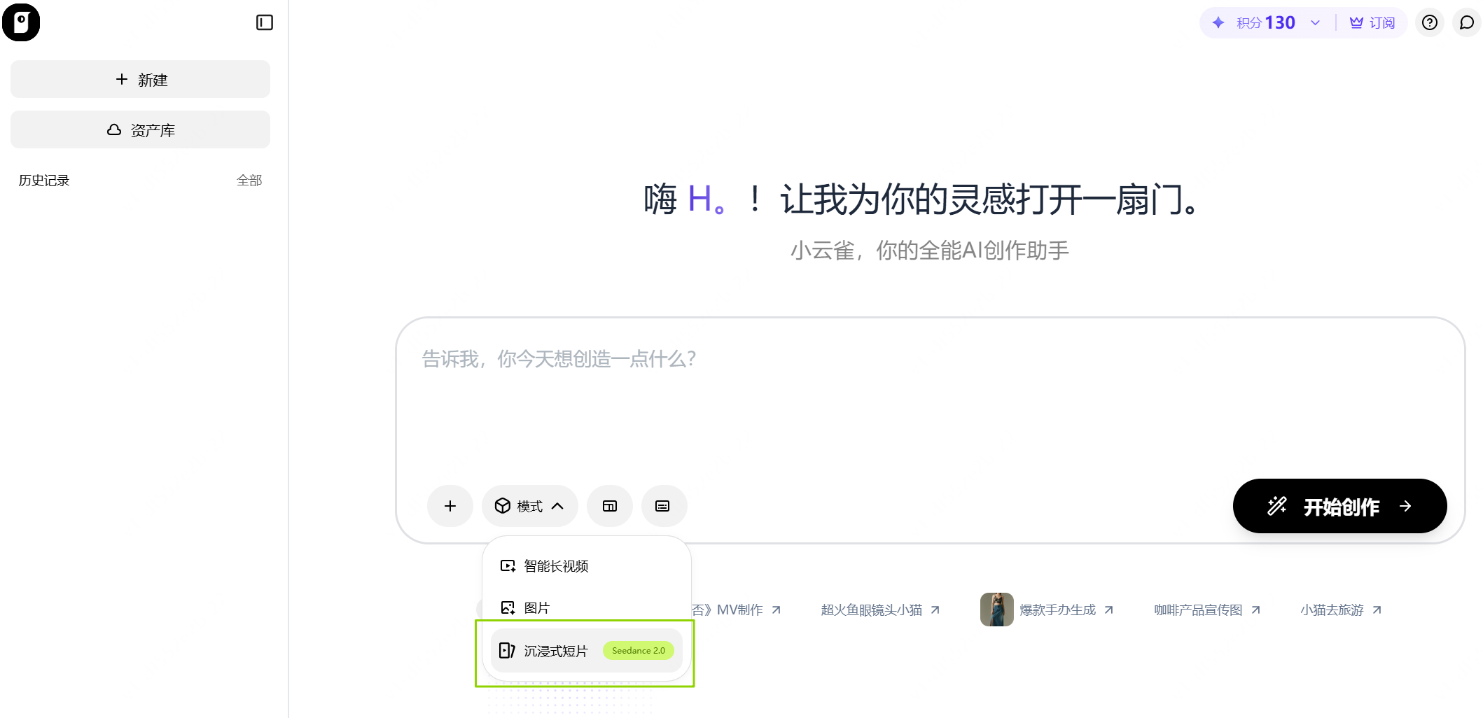 选择沉浸式短片生成模式即可体验Seedance 2.0功能。每个账号限用3次。