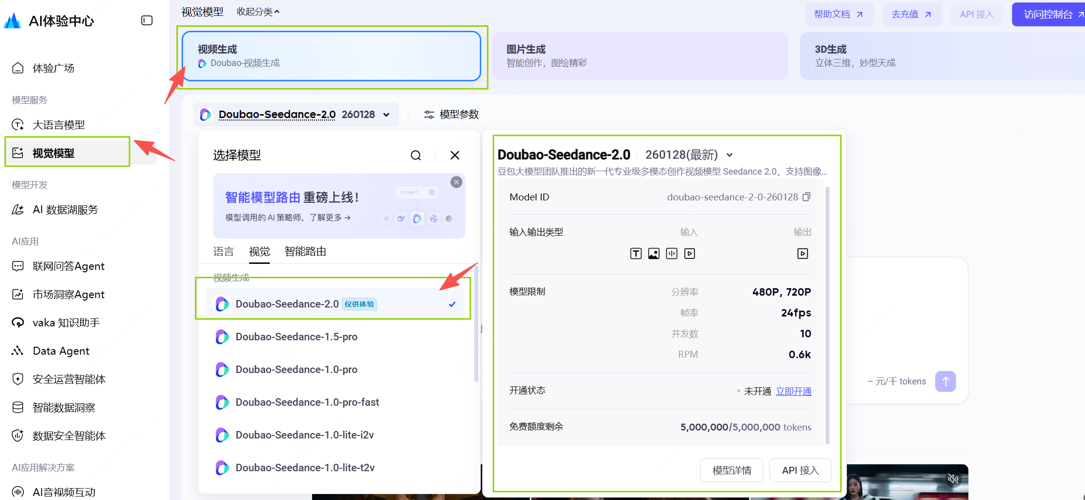 访问火山引擎官网,注册登录后进入AI体验中心。在视觉模型中选择Doubao-seedance-2.0即可体验。