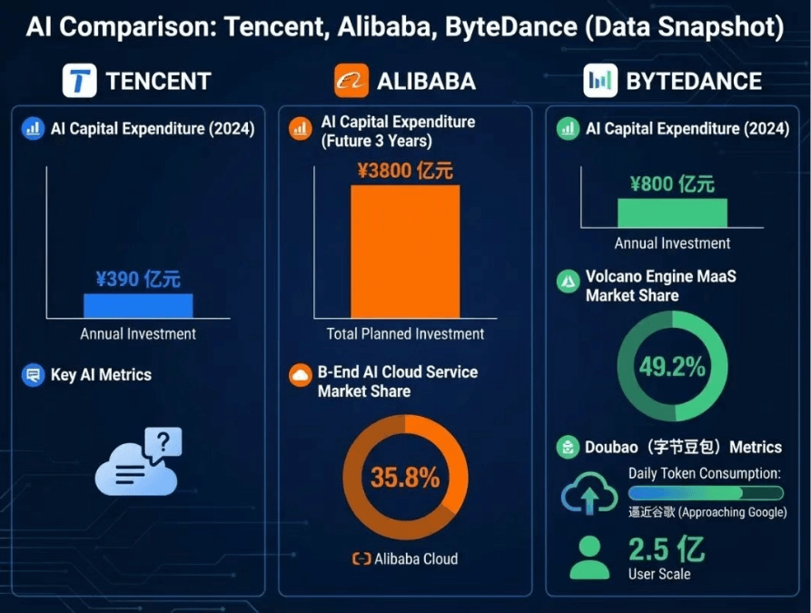 腾讯与阿里的竞争聚焦云端,与字节的较量则是流量争夺战。各方既有市场博弈,也存在生态互补。
