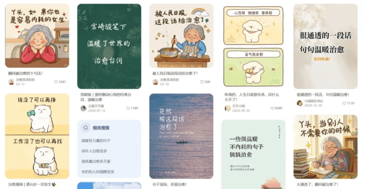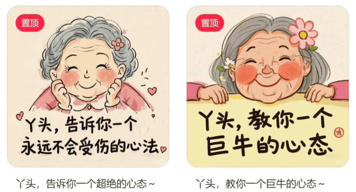 社交平台上经常能看到这类温暖人心的漫画作品:慈祥的老奶奶形象搭配治愈文案,总能收获超高互动率和涨粉效果。