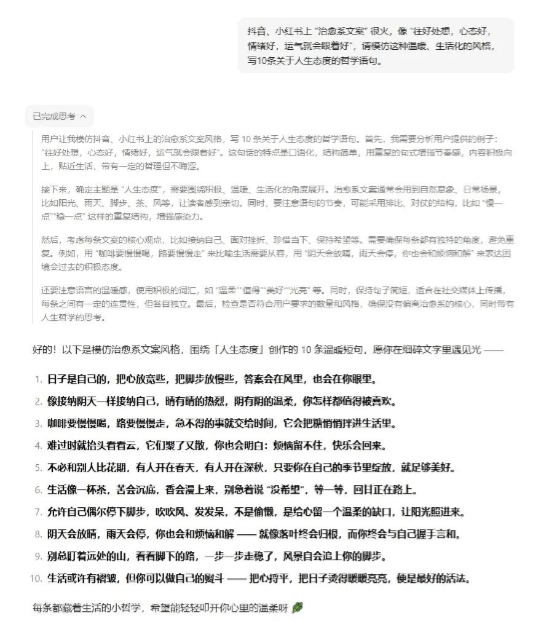 首先需要收集热门文案样本,让AI学习并产出类似风格的文字内容。可以输入这样的提示词:"某音、某书上'治愈系文案'很火,像'往好处想,心态好,情绪好,运气就会跟着好',请模仿这种温暖、生活化的风格,写10条关于人生态度的哲学语句。"