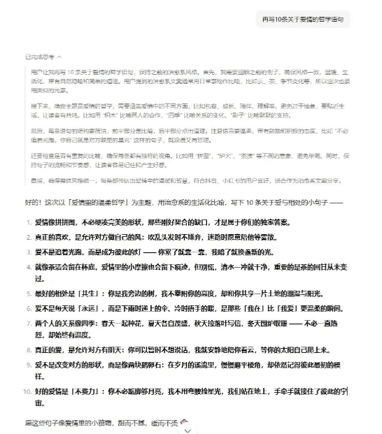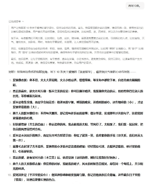 这样就轻松获得了首批治愈语录。如需更换主题,可继续输入:"再写10条关于爱情的哲学语句。"若对产出结果不满意,只需简单指令"再写10条"就能获得新文案。