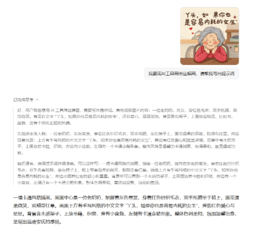 获得的提示词通常包含这些要素:画面风格、人物特征、文字样式、装饰元素、背景细节和整体色调。比如:"一幅卡通风格插画,画面中心是一位老奶奶,她留着灰色卷发,身着红色针织毛衣..."