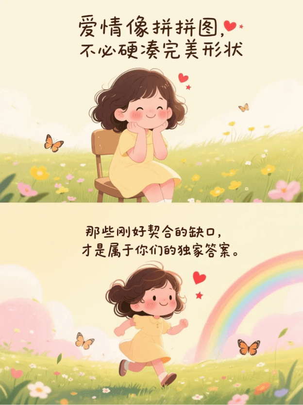 修改人物动作和文字内容后,继续生成漫画续集。比如将"双手托腮"改为"快乐奔跑",文字换成"那些刚好契合的缺口..."同样方法保存第二张图片。