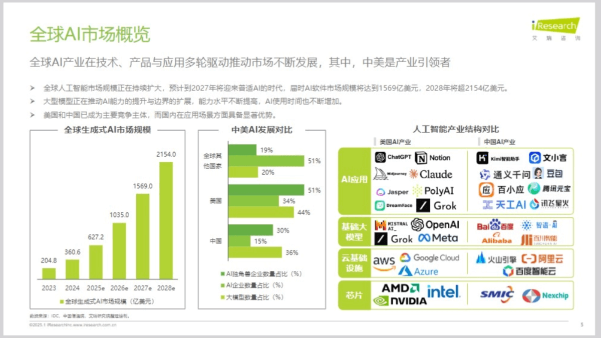 - 全球AI市场概览:预计2027年进入普适AI时代,中美两国主导产业发展。技术迭代与产品创新形成多轮驱动格局,市场规模持续扩张。