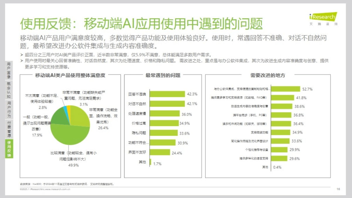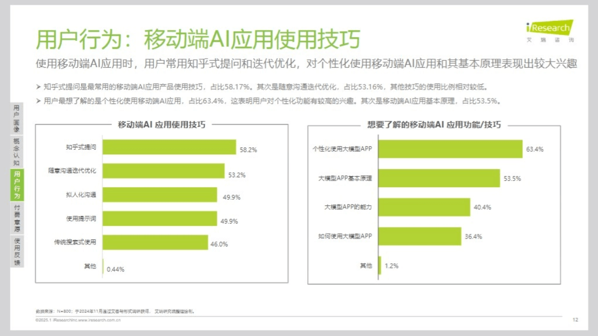 - 使用行为分析:效率提升和资料检索是主要使用场景,知乎式提问等技巧被广泛应用。用户对个性化功能需求强烈。