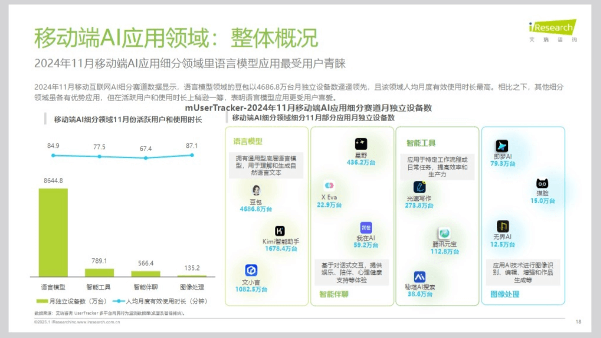 - 语言模型赛道:豆包等应用用户规模持续扩大,核心功能需求集中在智能问答和内容生成。