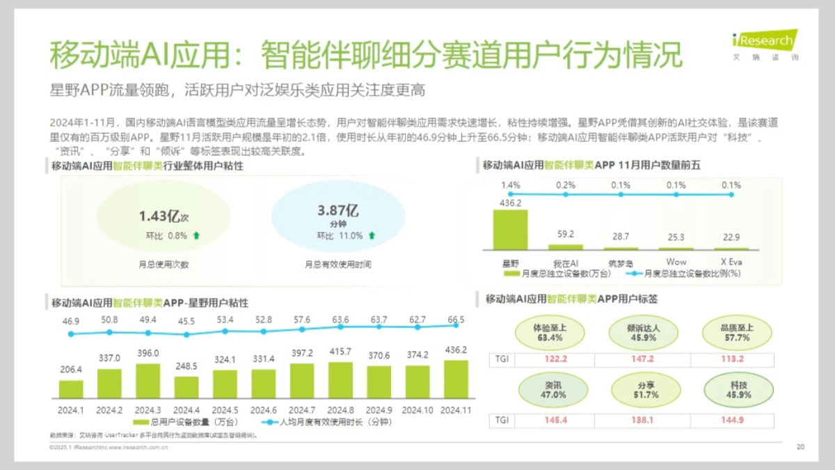 - 智能伴聊赛道:星野APP创新社交体验,泛娱乐需求推动用户增长。情感交互功能获得高度认可。
