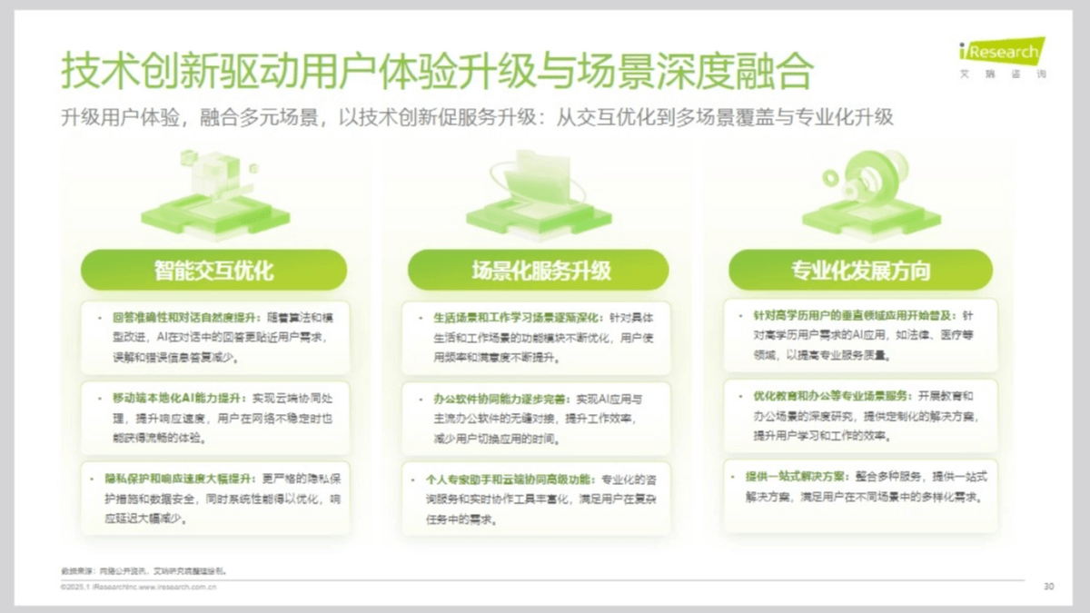 - 技术演进方向:本地化AI能力将强化隐私保护,垂直领域应用加速普及。办公协同等专业场景服务持续优化。