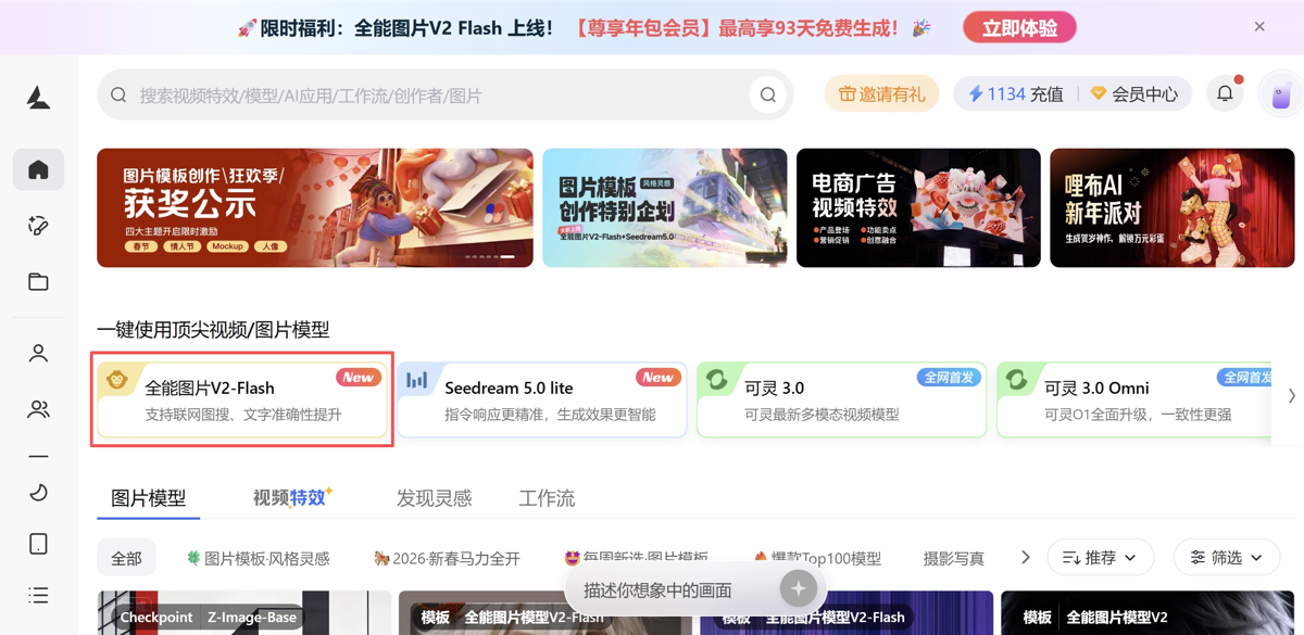 - 访问LiblibAI官网,在模型专区找到全能图片模型V2-flash,这就是Nano Banana 2的国内版本。
