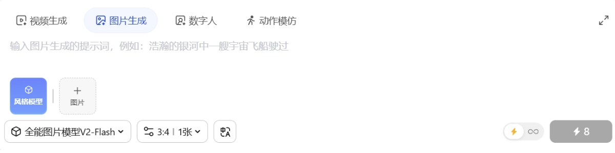 - 进入生图页面后,输入提示词并设置参数,点击闪电图标即可快速生成图像。