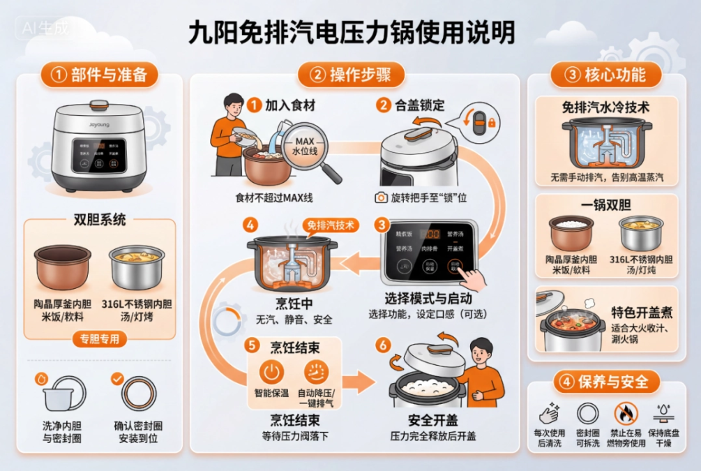 制作一份详细且视觉效果吸引人的信息图,解释[九阳免排汽电压力锅]的使用说明。