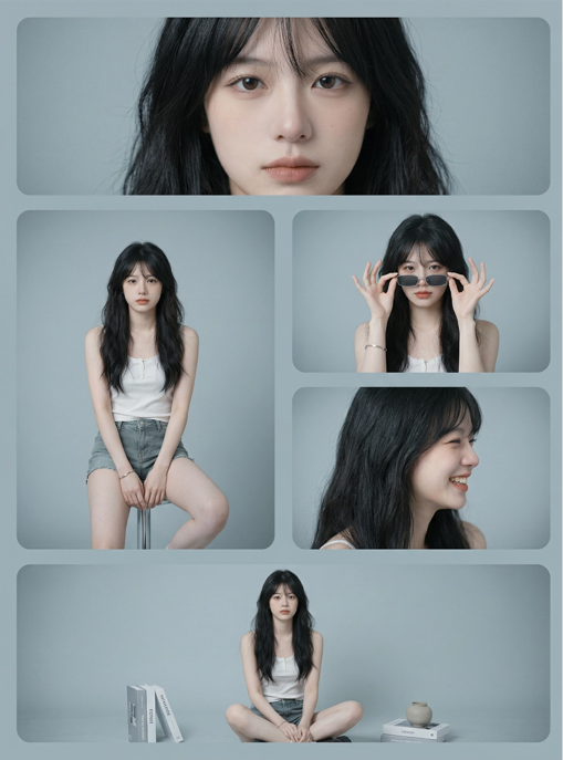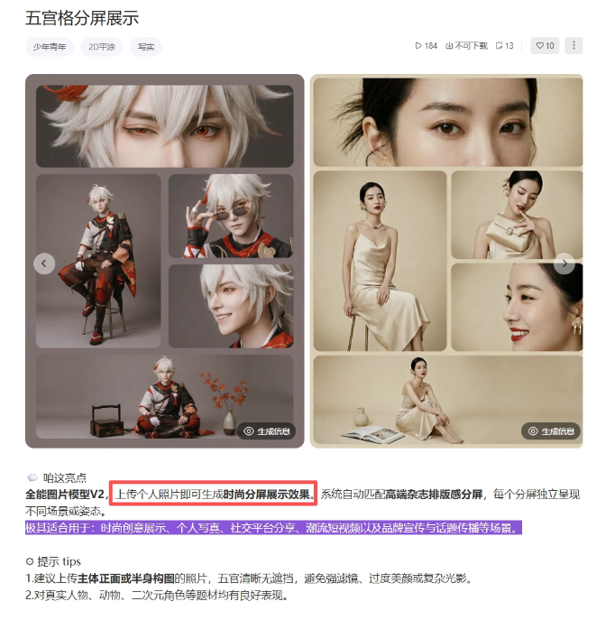- 丰富的玩法模板让新手也能轻松创作,比如一键生成分屏写真效果: