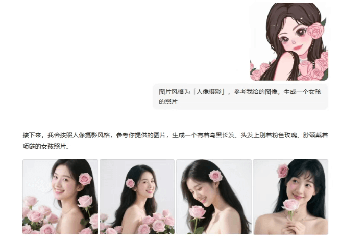 我们首先测试了人像生成功能。输入"参考图像生成女孩照片"的提示词后,系统会自动优化描述细节,如补充"乌黑长发配粉色玫瑰"等特征。