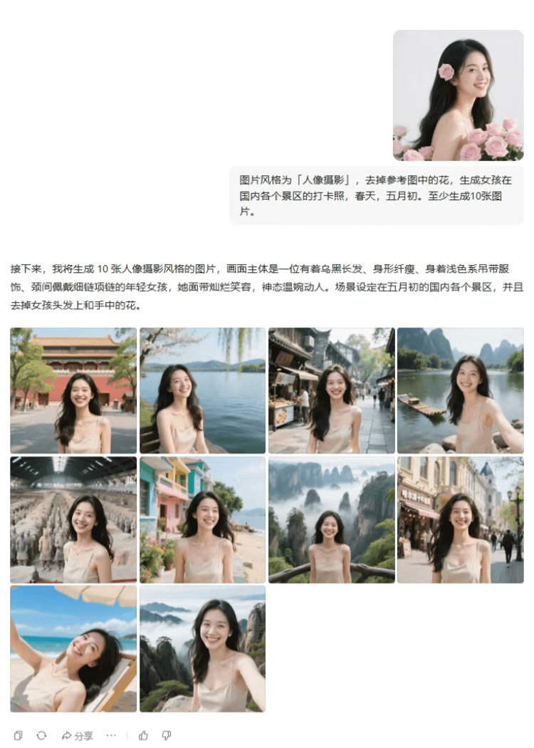 接着我们尝试了景点打卡功能。系统成功生成了10张不同景区的打卡照,并在保持人物一致性的前提下,完成了10套民族服装的展示。