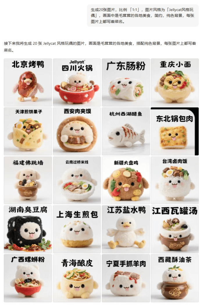 在纪念品设计方面,系统轻松生成了20款Jellycat风格的美食玩偶,每款都配有对应菜名。