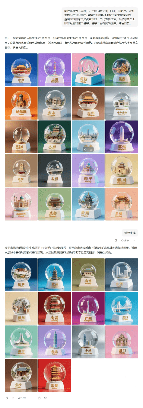 对于需要批量生成的场景,可分批次完成。我们成功制作了34个城市的水晶球微缩场景。