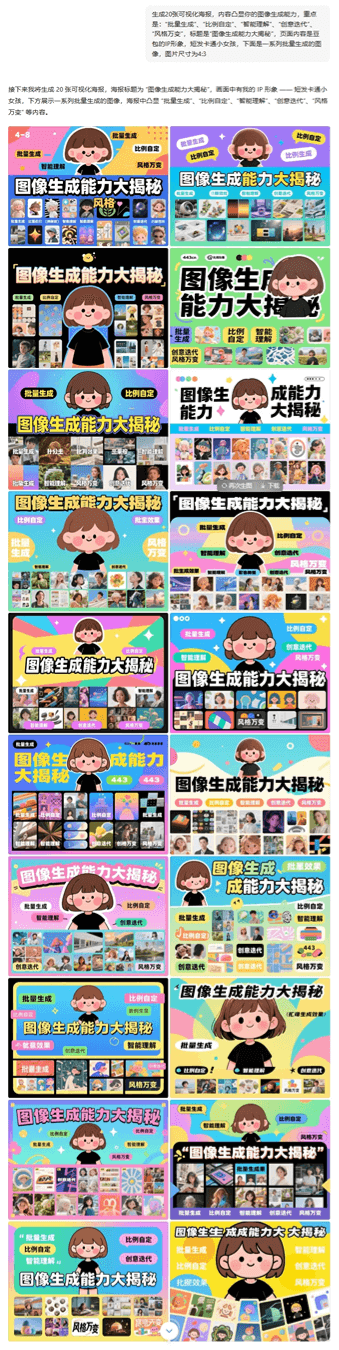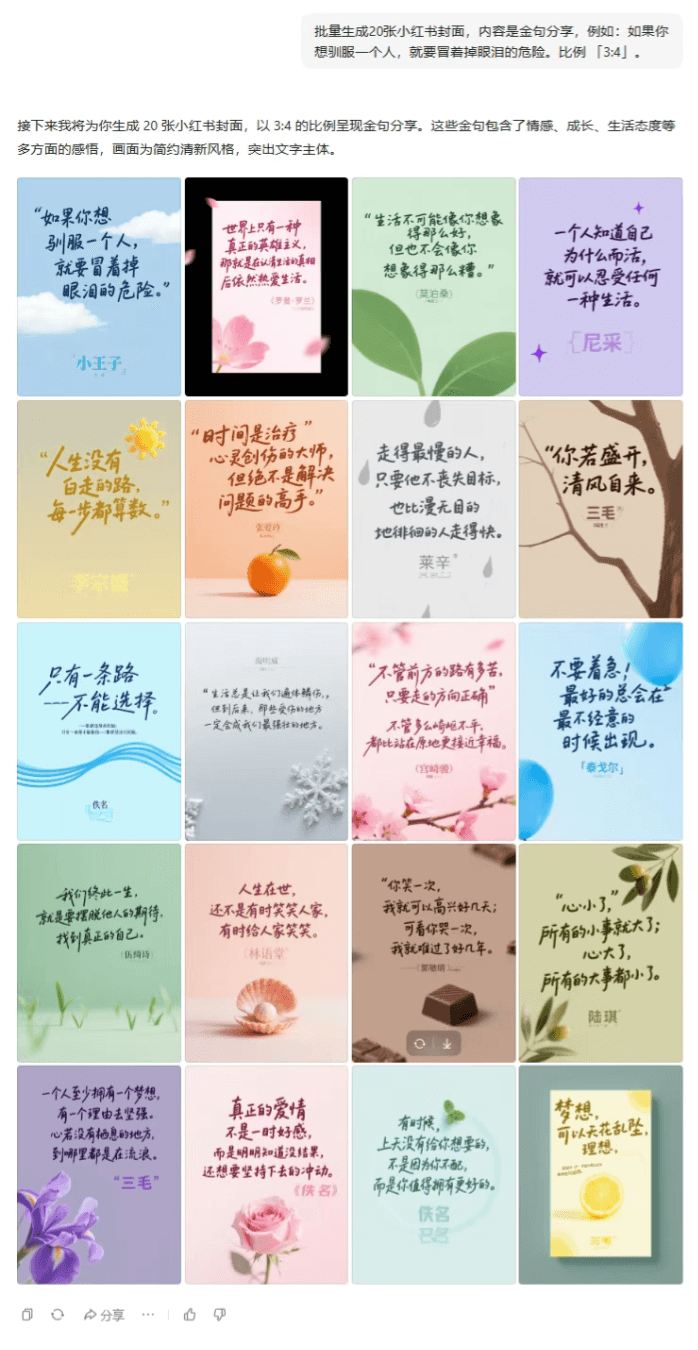 在社交媒体内容创作方面,系统可批量生成金句分享封面。我们测试了20张小红书封面,并保持9张同风格图片的一致性。