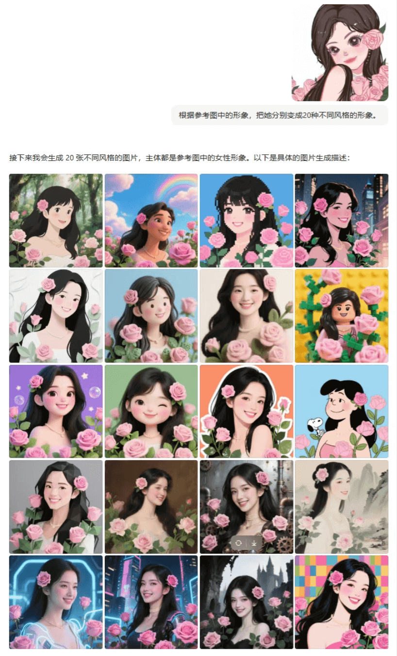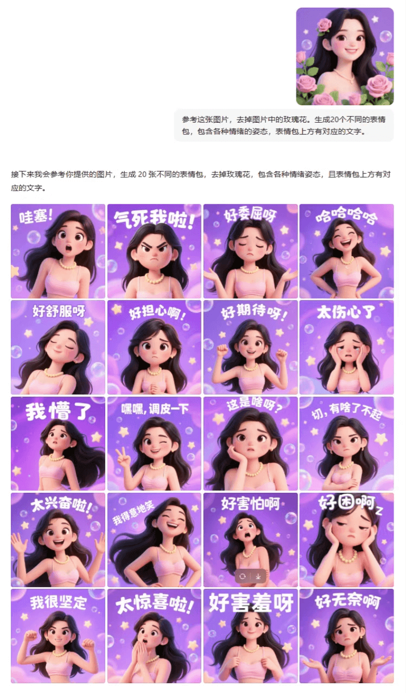 系统可将单一形象转化为20种不同风格,并生成系列表情包。
