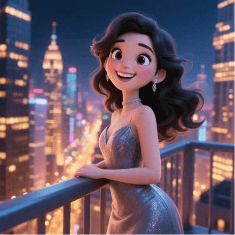 - 女孩来到城市的高处,俯瞰着灯火辉煌的城市夜景,她靠在栏杆上,感受着微风的吹拂,脸上露出满足的笑容。