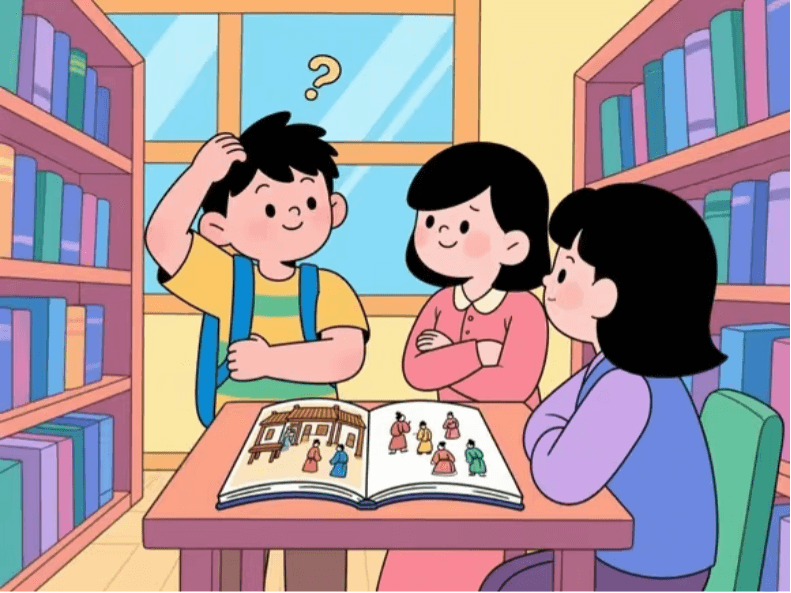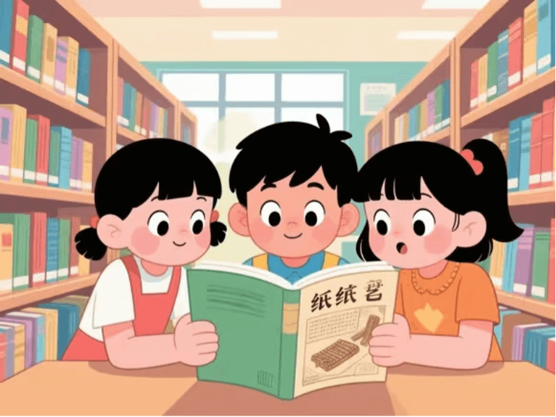 - 小朋友们在学校图书馆看到一本关于造纸术的书,被里面的内容吸引。