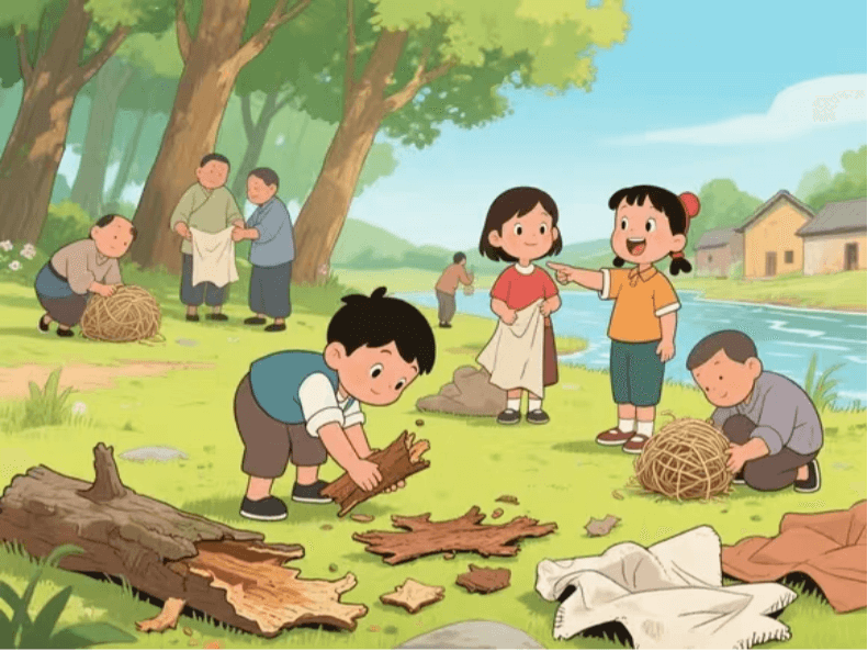 - 他们跟着村民去寻找书写材料,发现了树皮、麻头和破布等造纸原料。