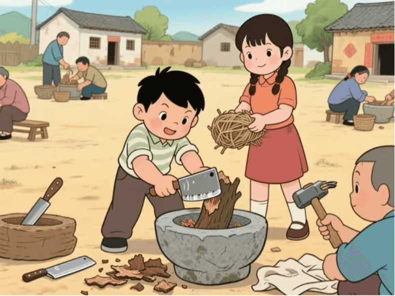 - 回到村子后,他们和村民一起开始准备造纸的工序,把原料切碎。