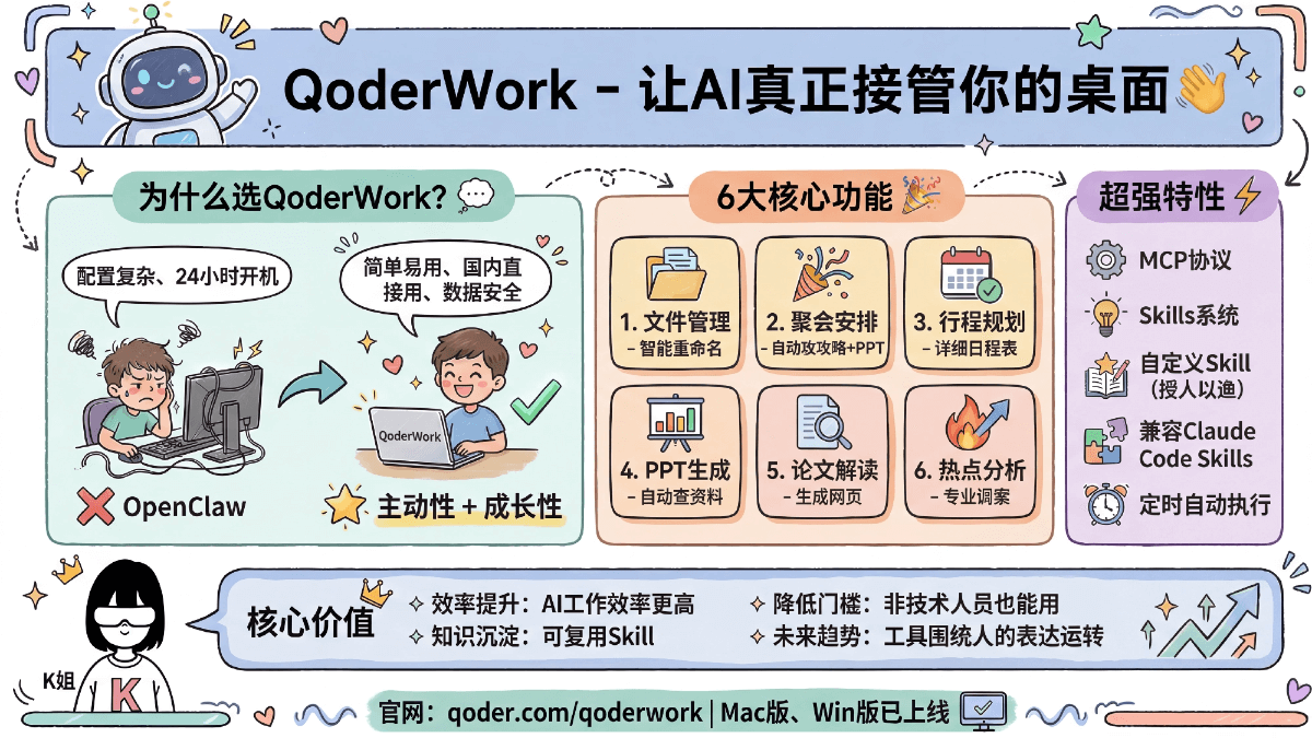 相比需要复杂配置的AI工具,QoderWork通过内置MCP协议和Skills功能,让普通用户也能轻松实现桌面智能化。其核心价值主要体现在三个维度: