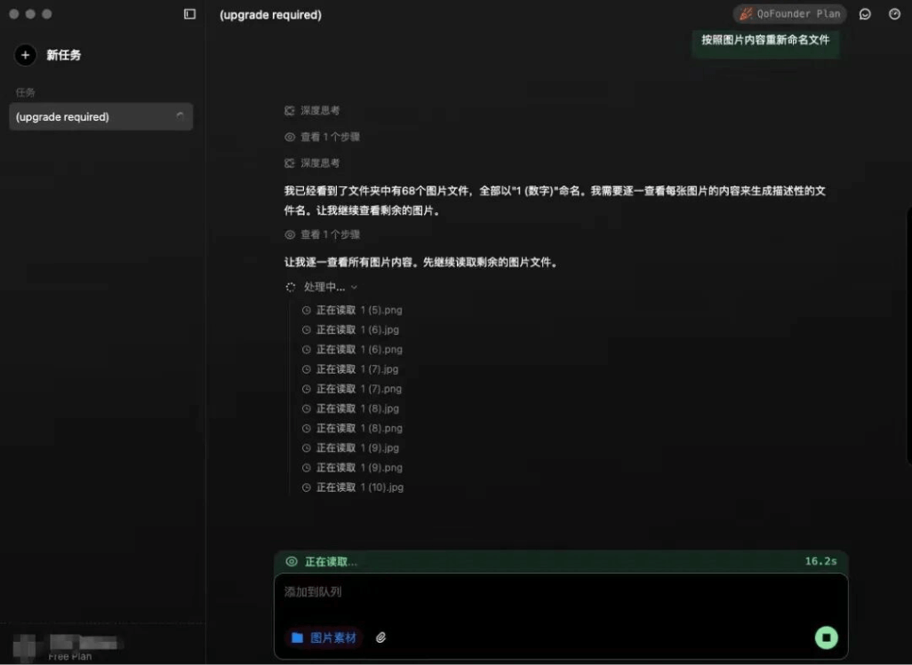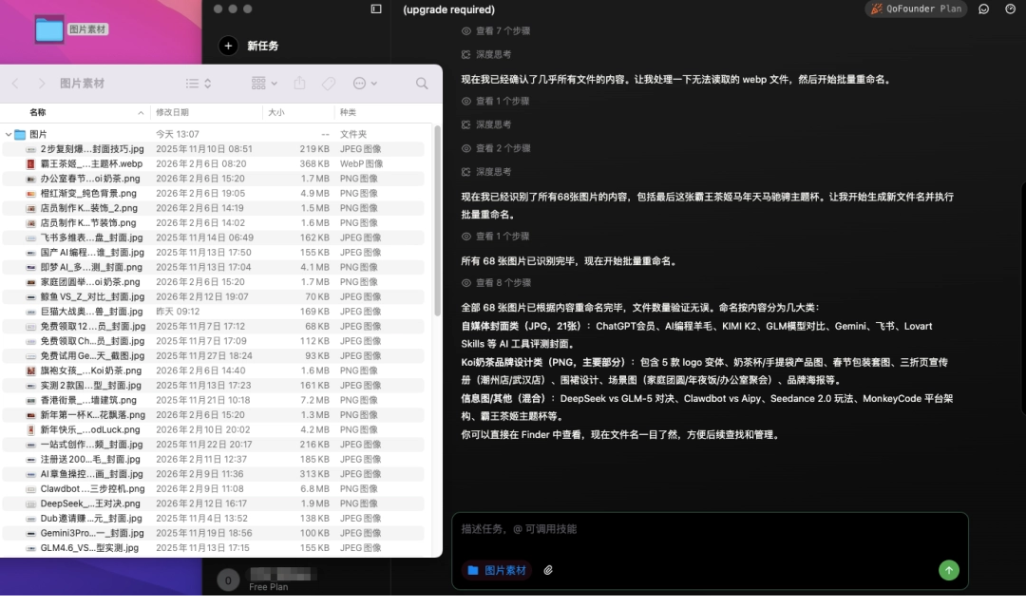 - 文件智能整理测试:输入"按照图片内容重新命名文件"指令后,系统自动分析图片特征并完成重命名。