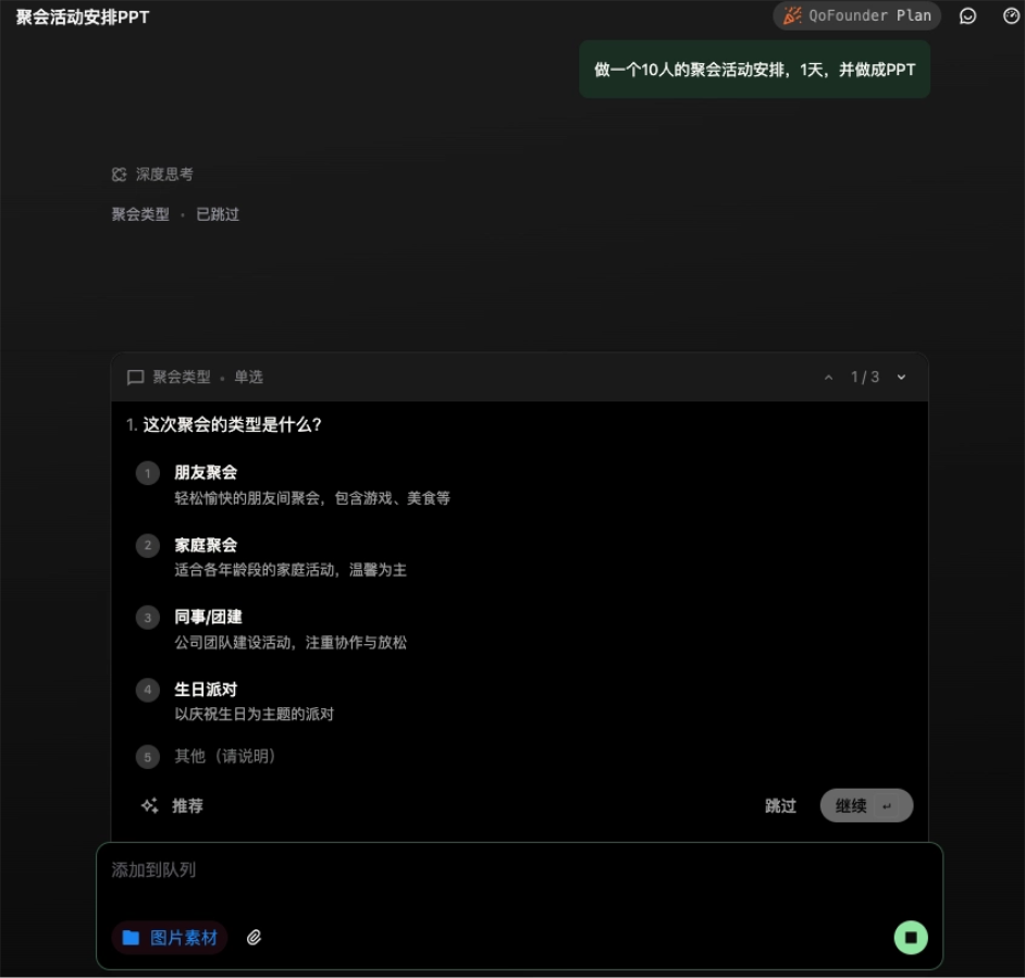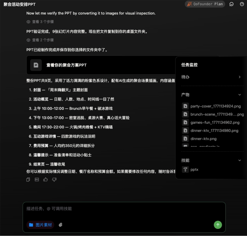 实测过程中,QoderWork展现出远超常规AI工具的主动学习能力。比如处理聚会安排时,会先确认参与者年龄段等细节;整理文件时,能准确识别图片内容特征。