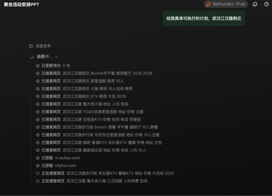- 聚会规划测试:输入10人聚会需求后,系统先确认具体参数,再自动生成包含路线、预算的完整方案。